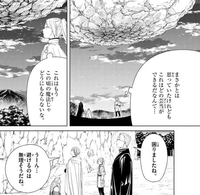 岩の塊が今にも落ちて来そうな状況に、この頃の魔法じゃどうにもならないな、とフリーレンも打つ手がない状況です。しかし、ヒンメル達は困ったとは言いつつも、妙に冷静な態度で慌てたそぶりを見せません。