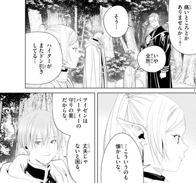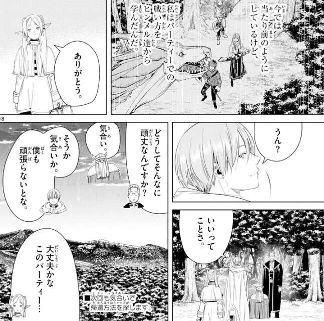 ヒンメルから、フリーレンもいい連携だった、助かったよ、と言われ、フェルンやシュタルクと戦う時にフリーレンは当たり前のように連携していましたが、パーティーでの戦い方をヒンメル達から学んだことをフリーレンは思い出します。フリーレンはヒンメルにありがとうと言い、いいってことさ、とヒンメルは答えます。その後ハイターはアイゼンに、どうしてそんなに頑丈なんですか?と聞くと、気合い、とだけ答えます。ヒンメルも気合いで頑張ろうと言い、気合いだけで乗り切ろうとするパーティーに、フリーレンは久々に不安を感じます。