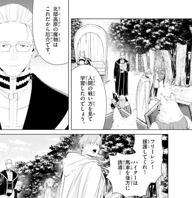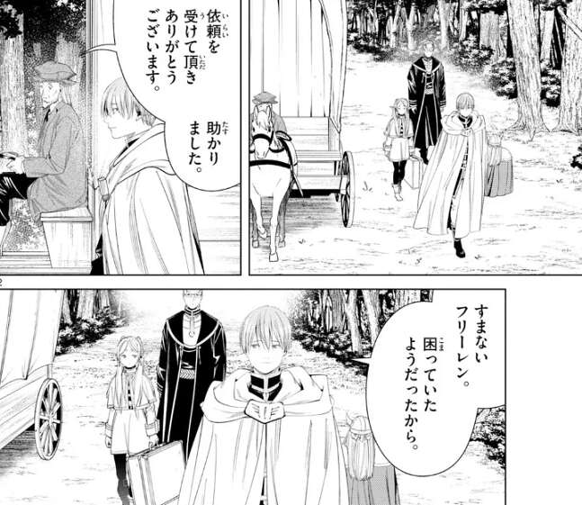 前回、ヒンメルが困っている商人の護衛の仕事を勝手に引き受けてしまい、ヒンメル一行は護衛をしながら北部高原を歩いています。ヒンメルはフリーレンに、未来への帰還方法を探す件が一旦中断した事を謝りますが、別にいいよ、急いでいるわけではなかったから、とフリーレンは答えます。しかし、私なら放っておくけどね、とフリーレンはちくりと毒舌も混ぜます。