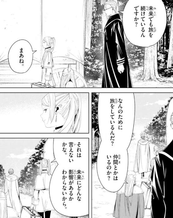 北部高原を歩きながら、ハイターは未来でも旅を続けているのかフリーレンに聞き、フリーレンは旅を続けていると答えます。アイゼンから、なんのために旅をしているんだ?仲間とかはいるのか?と、聞かれますが、フェルンやシュタルクに絡む質問なので、未来に影響があるかもしれないと言い、アイゼンの質問には答えません。