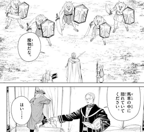 そんな話をしながら北部高原を歩いていると、一行は嫌な感じを察知します。フリーレンも魔力探知で気づいていて、かなりの数の魔物がきるようです。すると、弓や剣、盾で武装した人獣のような魔物が何体も襲い掛かってきます。