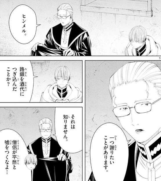 孤児院の建物を見て二人は幼少期を思い出し、昔を懐かしみます。そしてヒンメルは、勇者になる決意を初めて伝えたのがハイターだった事も思い出しますが、ハイターは一つ謝りたいことがあるとヒンメルに伝えます。路銀を酒代につぎ込んだことか?と、ヒンメルが聞くと、それは知りません、とハイターは答えます。しかし、路銀を酒代につぎ込んだことはあるようで、ハイターは僧侶なのに平然と嘘をついたようです。
