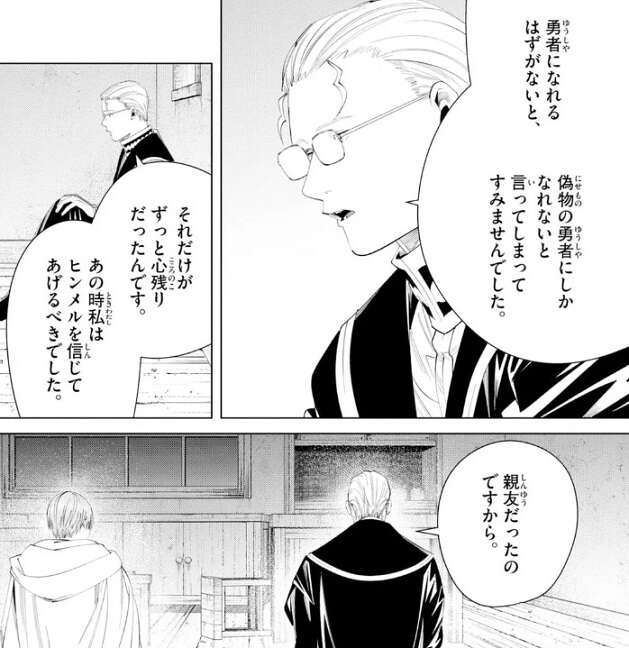 その頃ハイターはヒンメルに、勇者になれるはずがないと、偽物の勇者にしかなれないと言ってしまったようで、その事をハイターは謝ります。そして、あの時私はヒンメルを信じてあげるべきでした、親友だったのだから、とハイターは幼少期の事を悔やみます。