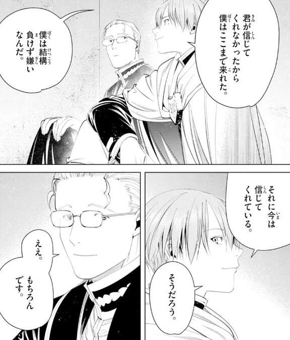 しかし、ヒンメルはハイターに感謝していると告げ、ハイターが信じてくれなかったからここまで来れた、僕は結構負けず嫌いなんだ、とヒンメルはハイターに言います。そして、今は信じてくれている、そうだろう、とヒンメルと聞くと、ヒンメルが勇者になれると信じているとハイターは答えます。そんな話をしてると建物の外で衝撃が走ります。フリーレンとアイゼンが竜と戦い始めたようで、ヒンメルとハイターも加勢へと向かいます。