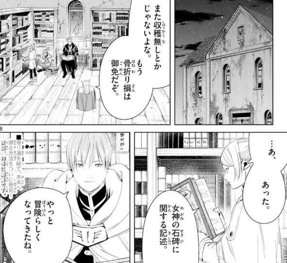 外の竜を倒してやっと、村長の家に入れたヒンメル達は女神の石碑に関する文献がないか探します。いくつもの書物を探すと、フリーレンが女神の石碑に関する記述を見つけます。やっと冒険らしくなってきたね、とヒンメルが言い、ようやくフリーレンが未来へと帰れる手掛かりが発見できた所で今週は終わりです。