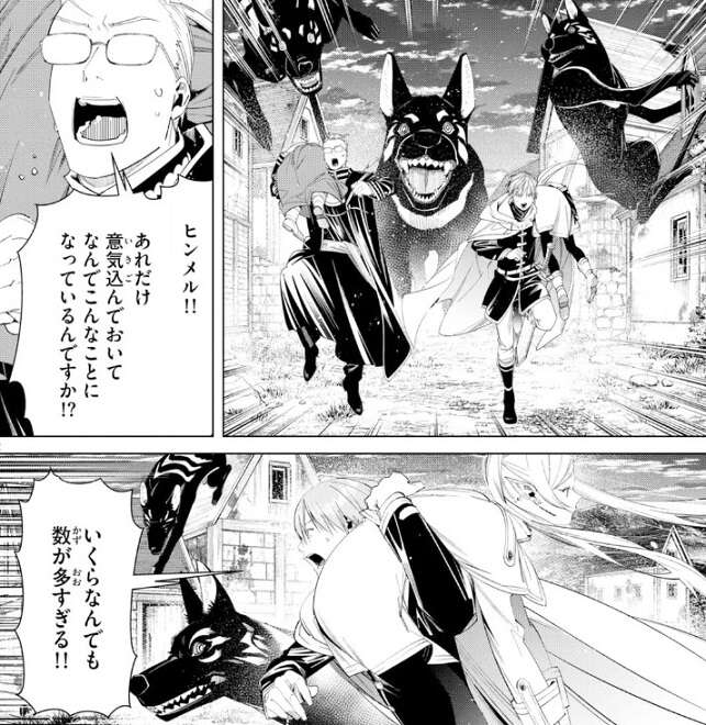 前回、ドワーフのキーゼルから女神に関する文献の情報を得ましたが、村は魔物の巣窟となっていると警告を受けていました。ヒンメルは望むところさ、と意気込んで村に立ち入りましたが、想像以上の魔物の巣窟となっていて、全員が全力疾走で逃げています。