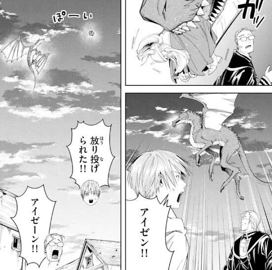 さらに上空から竜まで急降下して襲ってきてアイゼンが捕まってしまい、空中で放り投げられてしまいます。泣いて悲しむハイターですが、よく考えたら泣くほどのことじゃないか、とハイターは考え直します。アイゼンは異常に頑丈なので、あの程度の高さでは無傷です。それよりも魔物の群れに追われているヒンメル達の方がピンチですが、ヒンメルに策はなく結局根性論で走って魔物の群れから逃げます。