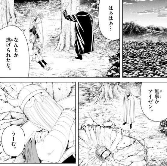ヒンメル達は何とか魔物の群れから逃げ切りますが、その先には地面にめり込んだアイゼンが倒れていました。そしてアイゼンは、自由落下程度ならあの程度の高さは無傷で何ともありませんでしたが、なにやら唸っています。