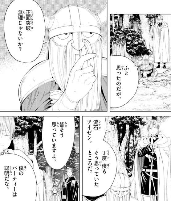 やっとアイゼンとヒンメルは、正面突破は無理と気づいたようです。しかし、ハイターとフリーレンは既に気づいていたようですが、僕のパーティーは聡明だな、とヒンメルはつぶやいて誤魔化します。