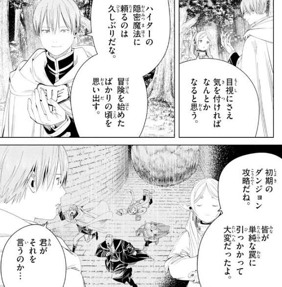 ハイターの隠密魔法をパーティー全体にかけた事で、魔力探知に引っかからなくなりました。これなら、目視にさえ気を付ければ魔物は何とかなりそうです。冒険を始めたばかりの頃はこうやってハイターの隠密魔法を使って、ダンジョン攻略をしていたようでヒンメルとフリーレンは昔を思い出しています。しかし、皆が単純な罠に引っかかって大変だったとフリーレンは言っていますが、誰よりもミミックの罠に引っかかっているフリーレンが言うのにはおかしいと思ったようで、君がそれを言うのか…、とヒンメルがツッコんでいます。