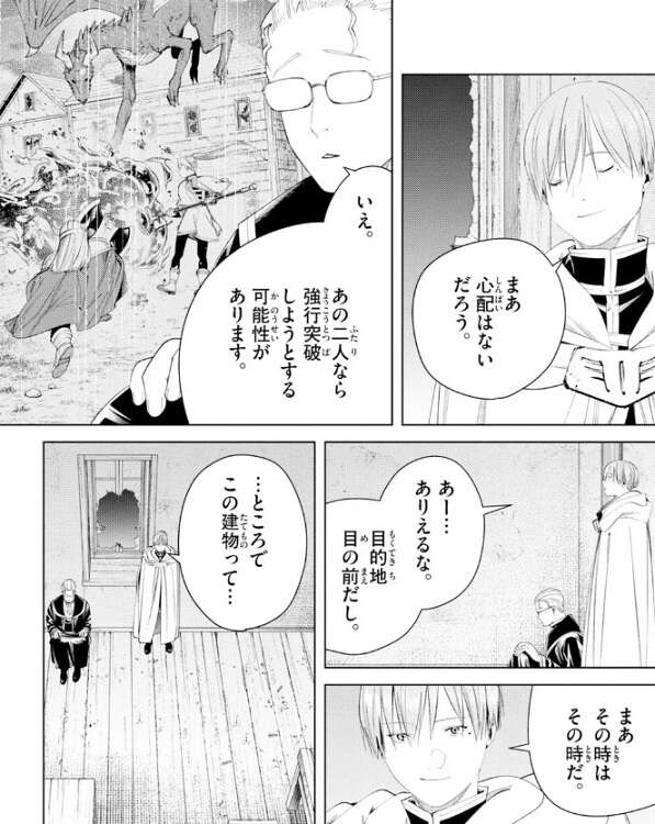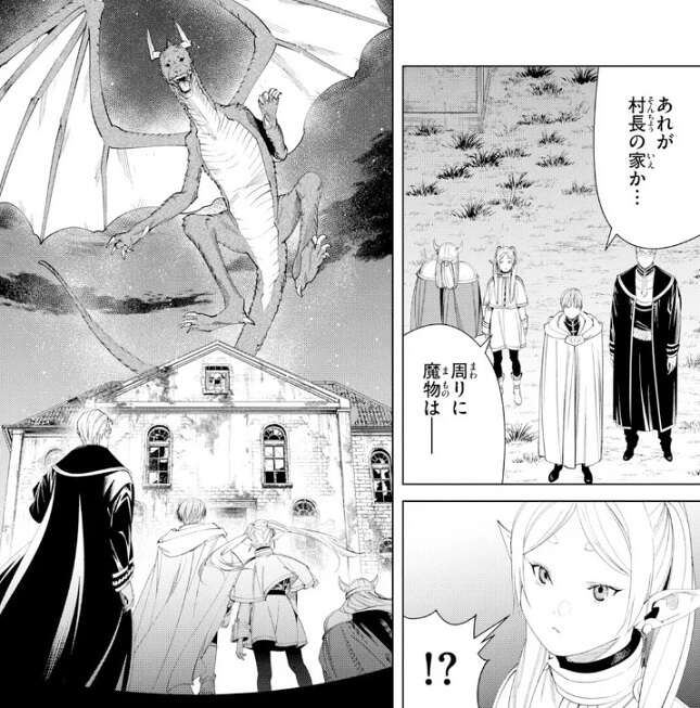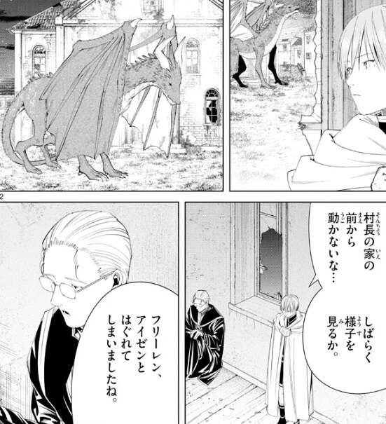 村長の家の前で竜はうろついていて、竜は離れようとしません。ヒンメルとハイターはしばらく様子を見る考えですが、フリーレンとアイゼンとはぐれてしまっています。