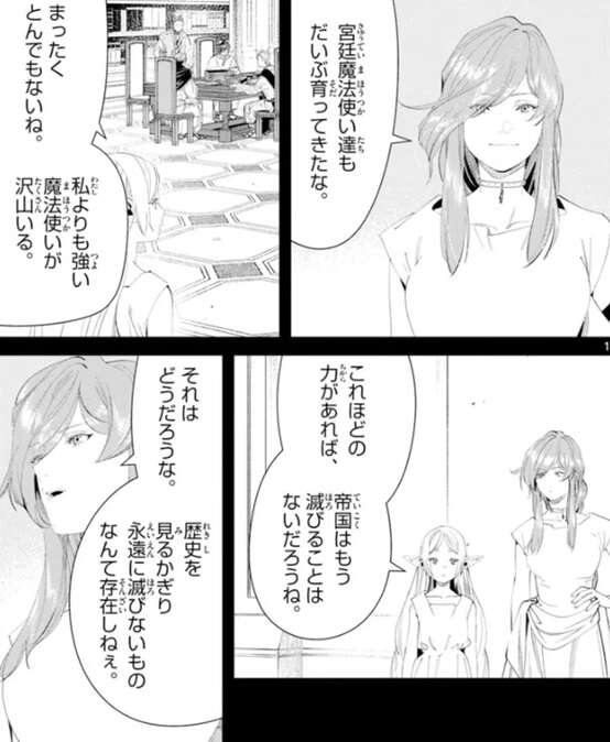 フリーレンの回想に移り、フランメは自分が育てた帝国の宮廷魔法使い達をフリーレンと見ています。帝国の宮廷魔法使い達はだいぶ育ったようで、フリーレンよりも強い魔法使いも沢山いるようです。これほどの力があれば帝国が滅びることはないだろうね、とフリーレンは言いますが、それはどうだろう、とフランメは言い、永遠に滅びないものは存在しない、良くも悪くも変わり続けて世界は動いていくんだ、とフリーレンに教えます。