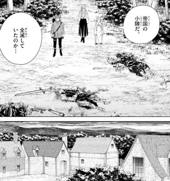 帝国の小隊が全滅していたことにフリーレン達は驚きますが、その後魔物の討伐が終わったことを村人に知らせます。村人は帝国の小隊の全滅を聞き、帝国の兵士達を丁重に弔いたいと思うとフリーレン達に伝えます。