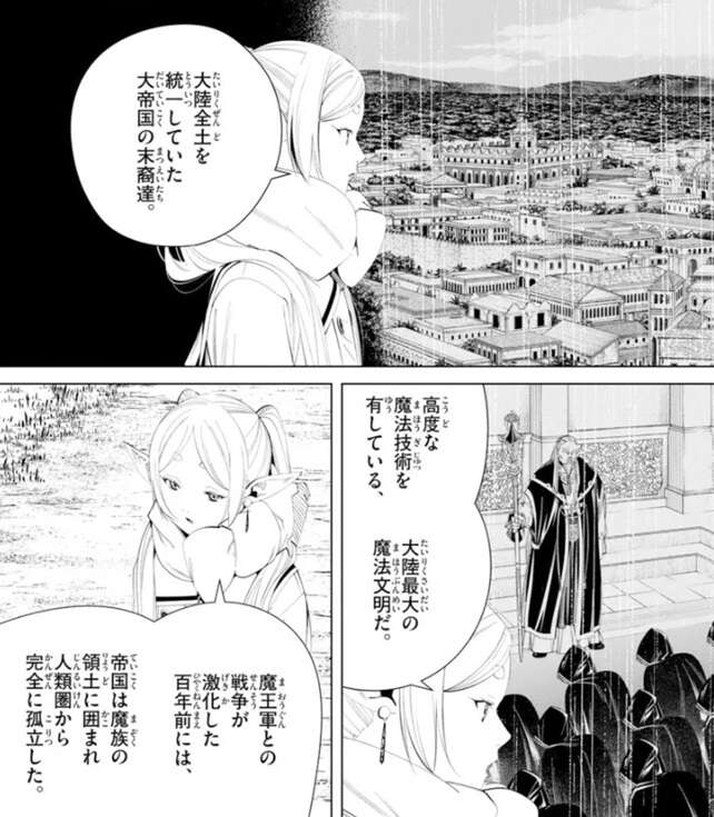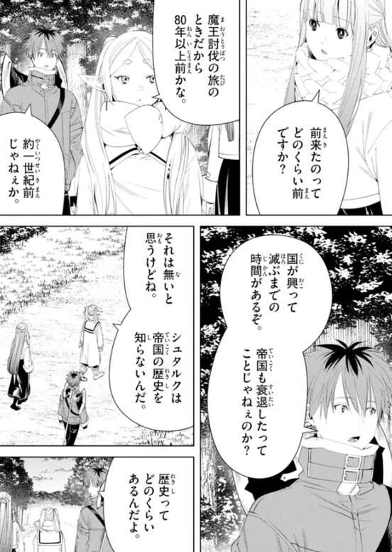 フリーレンが前に帝国領に来たのは80年以上前の魔王討伐の時以来で、国が興って滅ぶまでの時間があるぞ、帝国も衰退したってことじゃねぇのか?と、シュタルクは疑問を口にします。しかしフリーレンは、それは無いと思うけどね、シュタルクは帝国の歴史を知らないんだ、と言い帝国の衰退を否定します。