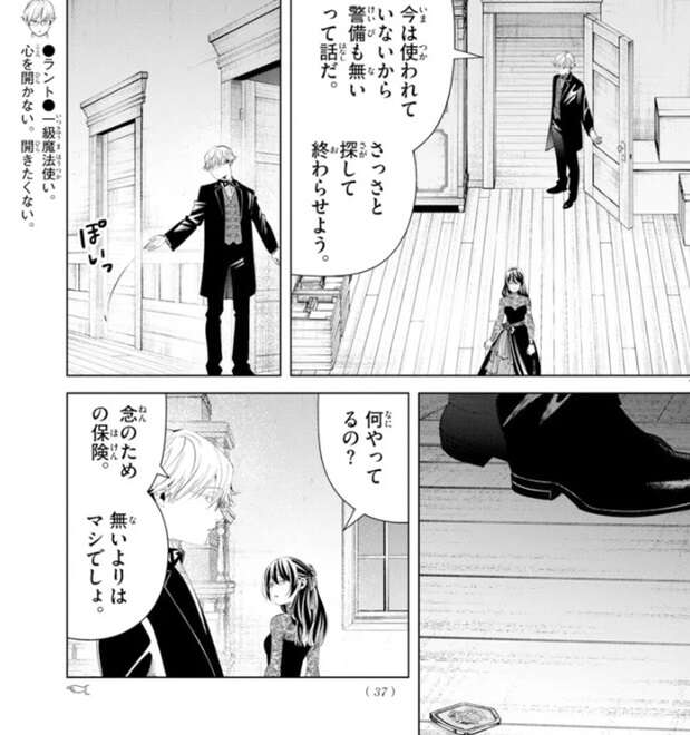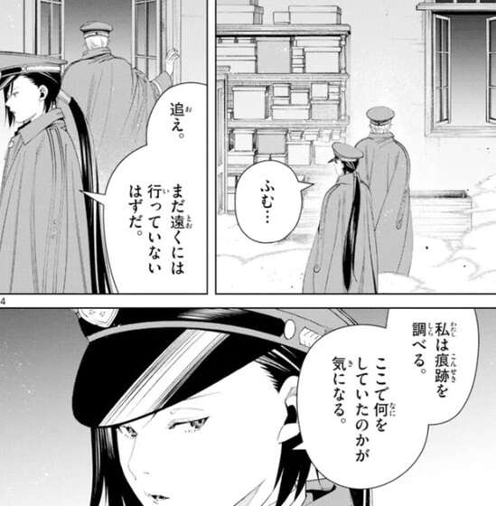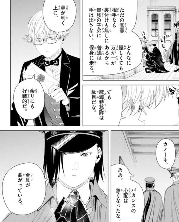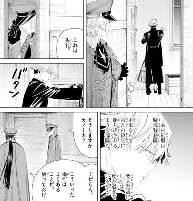 しかし、カノーネは扉の前に落ちているピンに気付き、それが帝国魔法学校の校章のピンだと確認します。ラントが別の参加者から盗んだピンですが、これで魔導特務隊の目を誤魔化すのが、ラントが事前に仕掛けておいた保険だったようです。もう一人の人間は、一応二人に身分を確認するかカノーネに聞きますが、貴族の子弟に恥をかかせて、北方の辺境カステンの門番の仕事に飛ばされた同期を知っているとカノーネは言い、倉庫から離れていきます。ここで、カノーネはもう一人をノイと呼んだので、黒髪の魔導特務隊がカノーネで、もう一人がノイという名前だと判明します。