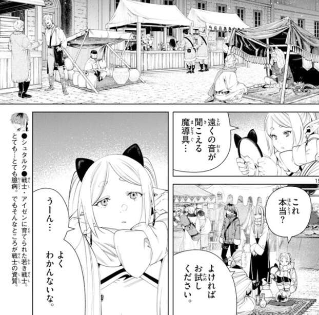 一方、帝都アイスベルクで見回り中のフリーレン一行ですが、フリーレンは今回の任務にやる気があまり起きないのか、早速街中で魔道具をあさり始めています。遠くの音が聞こえるという魔道具らしいですが、見た目が完全に猫耳のようです。