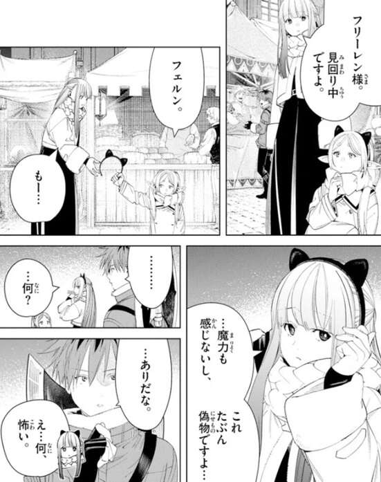 見回り中だとフェルンに注意されるフリーレンですが、フリーレンは猫耳のような魔道具をフェルンに渡します。フリーレンはこの魔道具が本物かどうかよく分からなかったようで、フェルンにもこの魔道具が本物か偽物か、確認して欲しいようです。猫耳のような魔道具を着けたフェルンは、魔道具から魔力も感じず、これたぶん偽物ですよ…、とフリーレンに言います。しかし、魔道具を着けたフェルンをシュタルクは見ると、…ありだな、とつぶやきますが、フェルンから怖いと言われてしまいます。