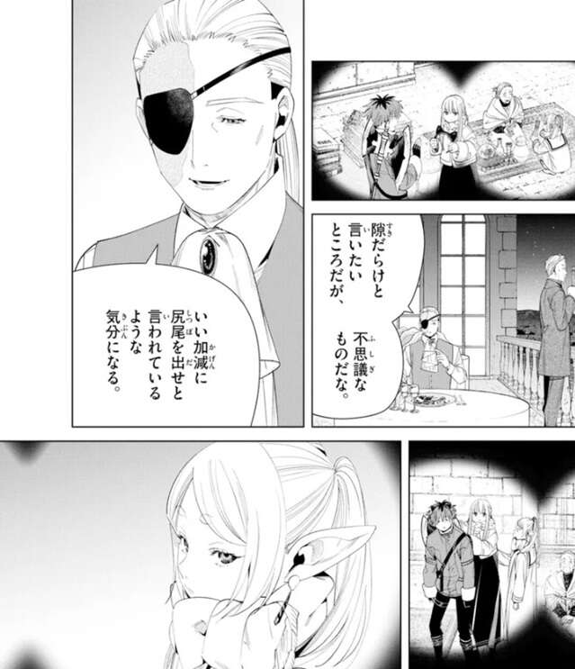 そのフリーレン一行の様子を、遠く離れた場所から前回出てきた影なる戦士と思われる男の付き人が観察しています。付き人は、微笑ましい光景ですな、閣下、と影なる戦士と思われる男に報告します。隙だらけと言いたいところだが、不思議なものだな、いい加減に尻尾を出せと言われているような気分になる、と影なる戦士と思われる男はつぶやきますが、その時付き人とフリーレンの目が合います。遠く離れた場所から監視しているので、フリーレンは簡単には気付けないはずですが、何かを察知したのでしょうか?
