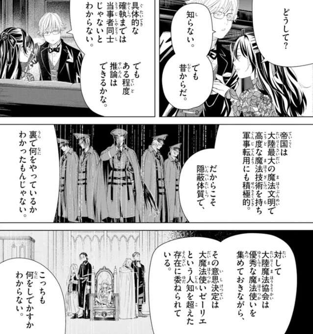127話では、帝国がゼーリエを暗殺する事情が少し見えてきました。帝国は大陸最大の魔法文明で軍事転用にも積極的ですが、だからこそ隠ぺい体質で裏で何をやっているか分からないようです。しかし、それは大陸魔法協会も同じようなもので、意思決定をゼーリエに全て委ねているので、こちらも何をしでかすか分からず、帝国と大陸魔法協会は仲が昔から悪いようです。