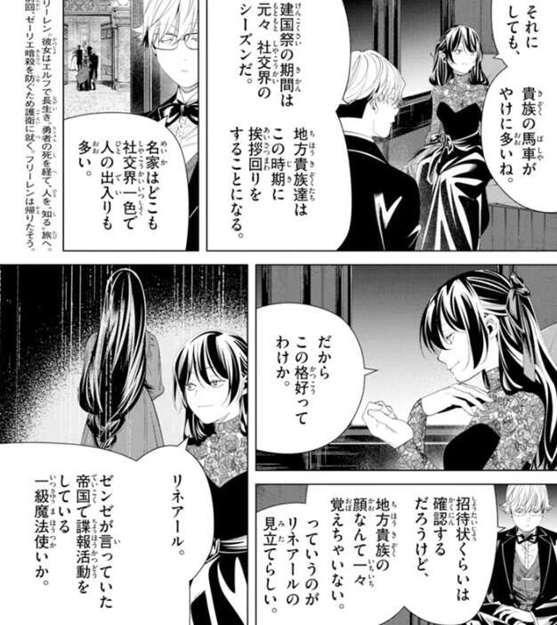 情報収集の任務を行っているラントとユーベルは、正装して馬車に乗ろうとしています。情報収集の任務の為にパーティーに出席するようですが、二人は帝国と大陸魔法協会の仲の悪さについて会話をしています。ラントは具体的な確執までは知らないようですが、二人は帝国と大陸魔法協会は昔から仲が悪いようです。帝国は大陸最大の魔法文明で高度な魔法技術を持ち、さらに軍事転用にも積極的ですが隠ぺい体質で、裏で何をやっているかわかったもんじゃないそうです。一方、大陸魔法協会は優秀な魔法使いを集めておきながら、意思決定は大魔法使いゼーリエという人知を超えた存在に委ねていて、ゼーリエ次第で何をしでかすかわかりません。ラントは仲良くなる要素はあると思う?と言い、ユーベルもどっちも怖いと言います。