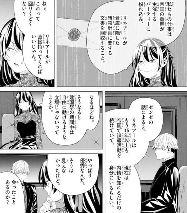 二人の任務は帝国の重臣が主催するパーティーに紛れ込んで、リネアールが倉庫に隠した暗殺計画に関する文章を回収することですが、ユーベルは回りくどいと言います。リネアールが直接ユーベル達に持ってくればいい、とユーベルは言いますが、リネアールはもう15年以上も帝国で諜報活動を続けているそうで、現在は内情を知れるだけの身分にいるそうですが、それだけの身分に上がると建国際の期間中は自由に動ける立場ないようです。ユーベルは北部支部で一度だけ、リネアールを見たことがあるそうですが、ゼーリエへの定期報告を終えると中庭で一日中蝶々を眺めていた変人、という印象しかないそうです。ユーベルはリネアールの事を変人と言いますが、それを一日中眺めていたユーベルも十分変人だ、とラントは言います。