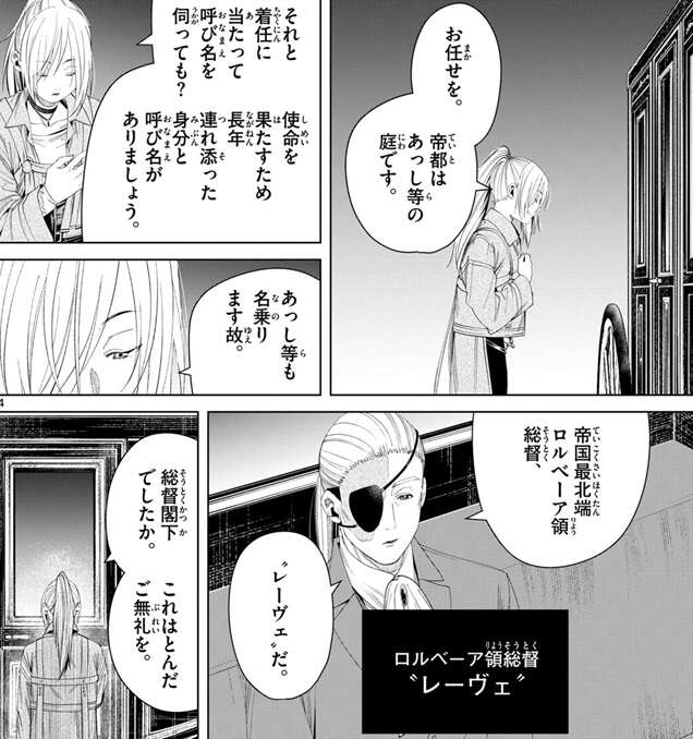 そして閣下と呼ばれていた男ですが、帝国最北端ロルベーア領総督、“レーヴェ”という身分と名前があるようです。閣下と呼ばれていたのでかなり高い地位の人間だと思っていましたが、総督という事はかなりの地位なので帝国の大勢の兵士に命令を出せそうです。今回で影なる戦士が他にも8人、任務を受けて動き出しましたし、フリーレンやゼンゼ達の敵はかなりの人数・規模になりそうです。ただ、魔導特務隊と影なる戦士達が連携している様子は今の所なさそうですが、お互い連絡を取っていたりするのでしょうか?その辺りも気になります。