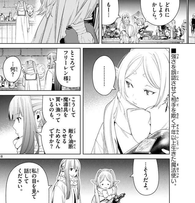 最後に浮浪者“ヴァルロス”は、広場で露店を出している露天商“ガゼレ”へと伝言を伝えます。全員正体を隠して町人のように装っていますが、影なる戦士なのでしょう。フリーレンはまだ広場の露店で魔道具を買い漁っていますが、後ろをヴァルロスが通り過ぎると何かを察したように振り返ります。しかしフェルンが、魔道具を買い漁っているのも、敵を油断させるためなんですか?と、確認すると、…そうだよ、とフリーレンは目を伏せながらしょんぼりした様子で答えます。フリーレンのしょんぼりした様子を見て、私の目を見て話してください、とフェルンは問い詰めますが、果たしてフリーレンはヴァルロスにきちんと気付いていたのでしょうか?