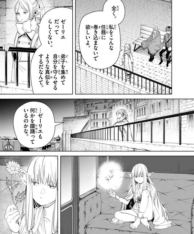 ゼーリエが弟子を集めて自分を守らせるような真似をするのを、らしくないとフリーレンは言い、…ゼーリエも何かを躊躇っているのかな、と想像します。しかし、フリーレンは考え過ぎか、とすぐに思い直し、きっと弟子に対人戦の経験を積ませる機会くらいにしか思っていない、とつぶやきます。