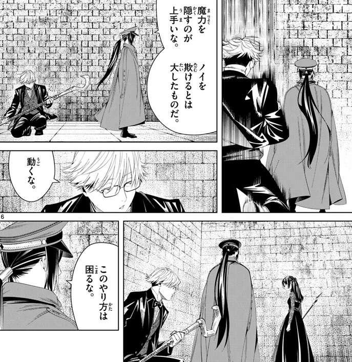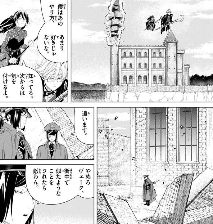 何とか見逃してもらったユーベルとラントは、魔法で飛行しながら逃げますが、ラントは、あのやり方、あまり好きじゃないな、と言い、知ってる、次からは気を付けるよ、とユーベルは答えます。一方、カノーネは瓦礫を敷地内に下ろしますが、ヴェークは逃げた二人の後を追いかけようします。しかし、街中で似たようなことをされたら敵わん、とカノーネは言い、ヴェークに追わないように言います。ノイにも手を出さないように伝えろ、とヴェークに言うと、存分に情報を落として貰おうじゃないか、ああいう手合いは一網打尽にするに限る、とカノーネは言い二人を暫く泳がせるようにヴェークに言います