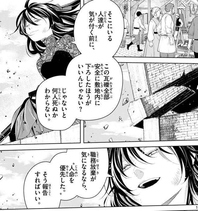 市場の人達が気が付く前に、この瓦礫全部安全に敷地内に下ろした方がいいんじゃない?じゃないと何人死ぬか分からない、職務放棄が気になるなら、“人命を優先した。”そう報告すればいい、とユーベルは言います。カノーネは、いいアイデアだ、採用しよう、と言いますが、屑が、さっさと失せろ、とユーベルを睨みながら言います。