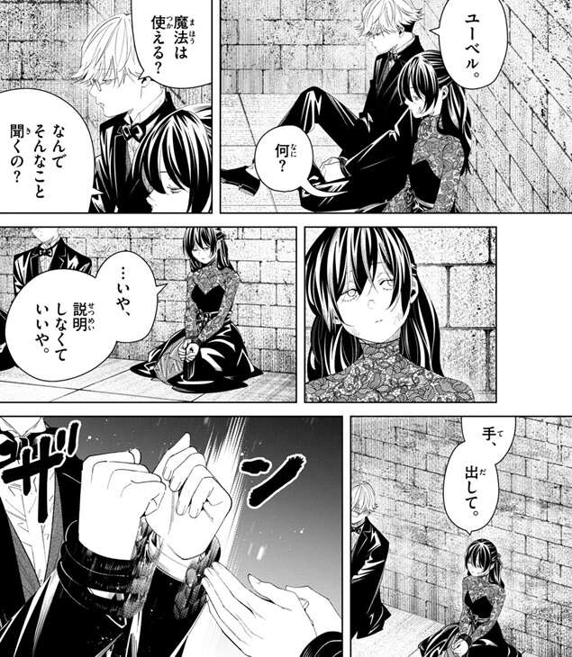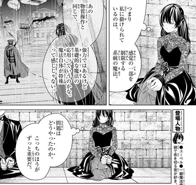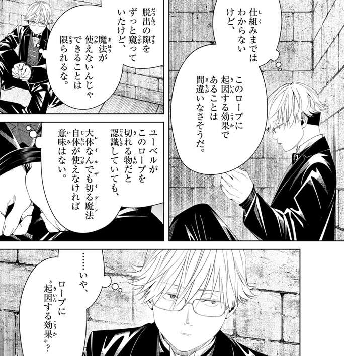 一方、ラントは手に付けられているロープを見ながら、やはり魔法が使えないと心の中でつぶやきます。ロープに起因する効果によって魔法が使えないようで、ラントは脱出の隙をずっと窺っていますが、魔法が使えないのなら出来る事は限られると、諦め気味です。しかし、ロープに起因する効果で魔法が使えないのなら、ユーベルの大体なんでも切る魔法(レイルザイデン)で何とか出来ないかとラントは考えます。一級試験の時にゼンゼの複製体をユーベルはレイルザイデンで打ち破っていて、ゼンゼの髪には幾重もの防御術式がかけられていましたが、ユーベルのレイルザイデンはゼンゼの髪に“起因する効果”を全て無視できたのなら、このロープに起因する効果も無視して切れるのではと考えます。