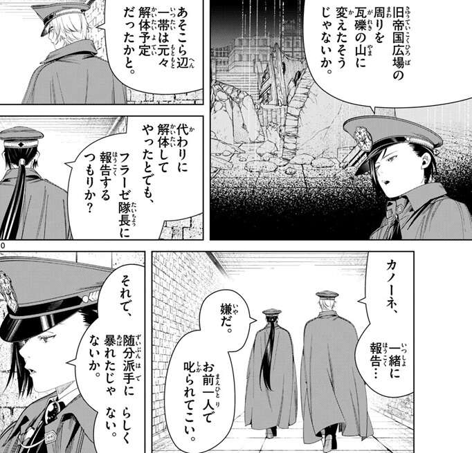 一方、ノイはカノーネを連れてユーベルとラントを収監した部屋へと向かっていました。カノーネはノイを馬鹿だろと怒り、旧帝国広場の周りを瓦礫の山にした事を責めます。あそこらへん一帯は元々解体予定だった、とノイは言い訳をしますが、代わりに解体してやったとでも、フラーゼ隊長に報告するつもりか?と、カノーネは言います。ノイはカノーネに一緒に報告して欲しそうですが、カノーネは嫌だと言い、お前一人で叱られてこい、と言います。