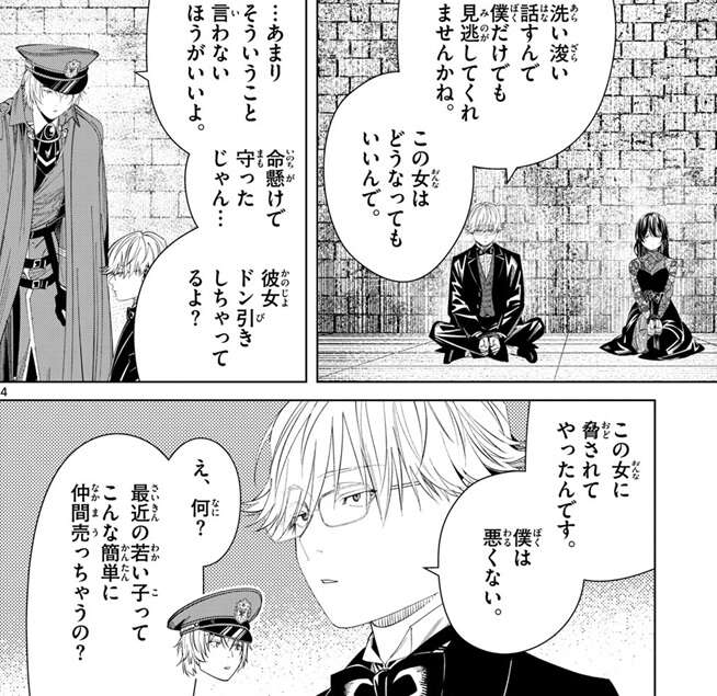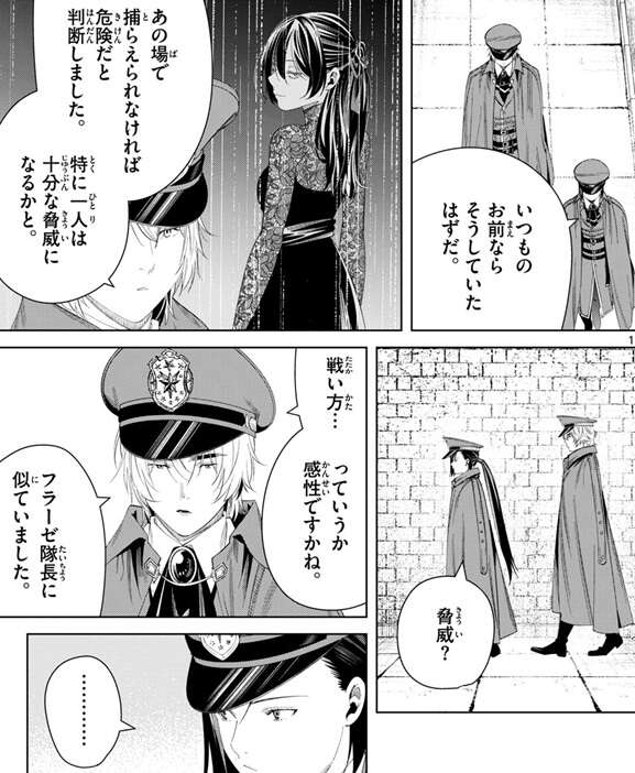 そしてノイに、相手が投降に応じず、交戦の可能性があるのなら、私の合流を待つべきだった、とカノーネは言い、いつものお前ならそうしていたはずだ、らしくないとノイに言います。あの場で捕えなければ危険だと判断しました、とロイは答えて、特にユーベルが十分な脅威になる、と言います。戦い方…、っていうか感性ですかね、フラーゼ隊長に似ていました、とロイが言うとカノーネは何か考え込んでしまいます。