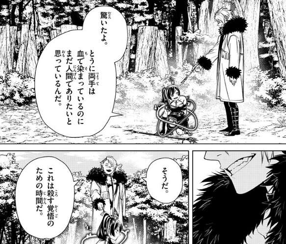 ヴィアベルは自分が体験した戦場での出来事をユーベルに話しますが、なかなかユーベルを殺そうとしません。ユーベルはヴィアベルが時間稼ぎに乗った理由を察し、まだヴィアベルが人間でありたいと思っていることを見抜きます。ヴィアベルはユーベルを殺す覚悟出来ていなかったので、あえてユーベルの時間稼ぎに乗りましたが、俺は躊躇い、臆することはあっても、必要な殺しは全部やってきたぜ、と言うとヴィアベルは覚悟を決めユーベルを殺そうとします。