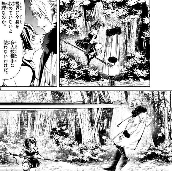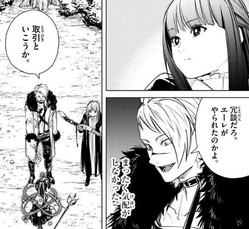 切り裂く魔法が届かないと分かりユーベルは、また基礎的な魔法で殴り合うの?と、ヴィアベルに聞きますが、その必要はねぇ、とヴィアベルは言います。場面変わってエーレはフェルンに、ヴィアベルが使う魔法には品性がまるでなく、勝つための卑怯な魔法、と言い、今、ヴィアベルと戦っている子、たぶん殺されちゃうわよ、とエーレはフェルンに忠告します。