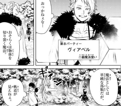一方、ヴィアベルと戦っているユーベルは、切り裂く魔法を使ってヴィアベルを攻撃しますが、ヴィアベルに防がれています。ヴィアベルはユーベルの魔法の軌跡が見えず、全ての魔法を防ぐのは無理そうですが、ユーベルの魔法の射程は5m程と見切って射程内に入らないようにします。