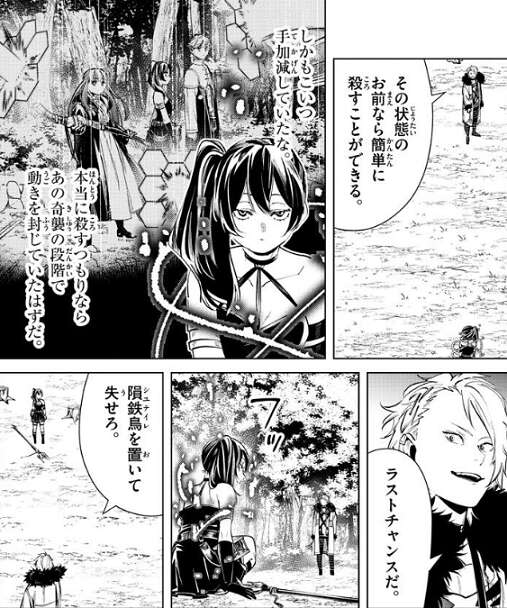 39話ではフェルンは第8パーティーに襲われた直後で話が終わっていましたが、今回はその続きです。ユーベルとヴィアベルの戦いは、ヴィアベルがユーベルを魔法で拘束しますが、時間稼ぎに乗っている間にフェルンの接近を許してしまいます。ヴィアベルは殺すことに拘らなければ、隕鉄鳥を奪うことも出来た気もします…。この後フェルンはどんな交渉をするのか、ラントの戦いの行方もありますし、話の続きが気になります。