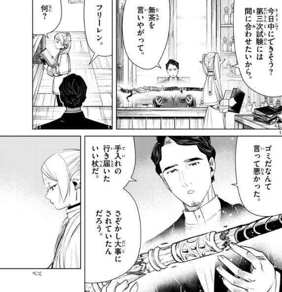 リヒターはフェルンの杖を直し始めますが、フリーレンは第三次試験には間に合わせたいからと、今日中に直して欲しいと言います。無茶を言いやがって、と言いながらもリヒターはフェルンの杖を直しますが、手入れの行き届いたいい杖だと分かり、ゴミだなんて言って悪かった、とリヒターはフリーレンに謝ります。
