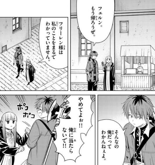 一方、フェルンとシュタルクは宿に帰ろうとしますが、フェルンはフリーレンが自分の事をまるで分っていないと、まだ怒っています。そんなの俺だってわかんねぇよ、とシュタルクが言うと、フェルンはポコポコとシュタルクを叩いて、シュタルクに八つ当たりします。シュタルクから、わかろうとするのが大事だと思うんだよ、フリーレンは頑張っていると思うぜ、と言われますがフェルンは納得出来ません。