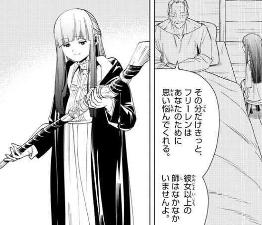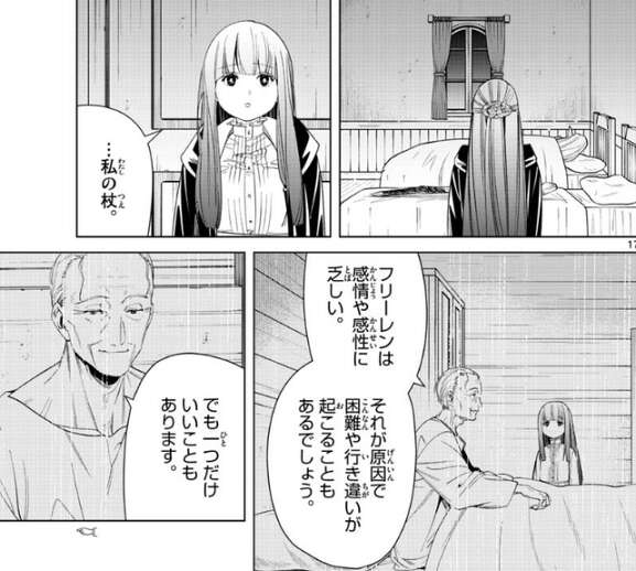 納得出来ないまま、フェルンが宿に戻るとフリーレンが戻っていて、フェルンのベッドの上にはフェルンの杖が直った状態で置かれています。それを見たフェルンはハイターとの会話を思い出します。ハイターは、フリーレンは感情や感性に乏しい、それが原因で困難や行き違いが起こることもあるでしょう、とフェルンに話しています。でも一つだけいいこともあります、とハイターはフェルンにさらに話します。