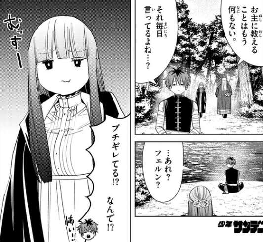 シュタルクが、また知らないお爺さんに絡まれています。シュタルクがあきれていると、知らないお爺さんと入れ替わりに、今度はフェルンがやって来ますが、フェルンがブチギレてます。シュタルクが怖がっていると、フェルンが理由を話してくれますが、どうやらまたフリーレンと喧嘩したようです。