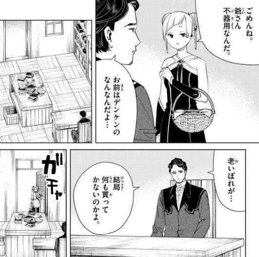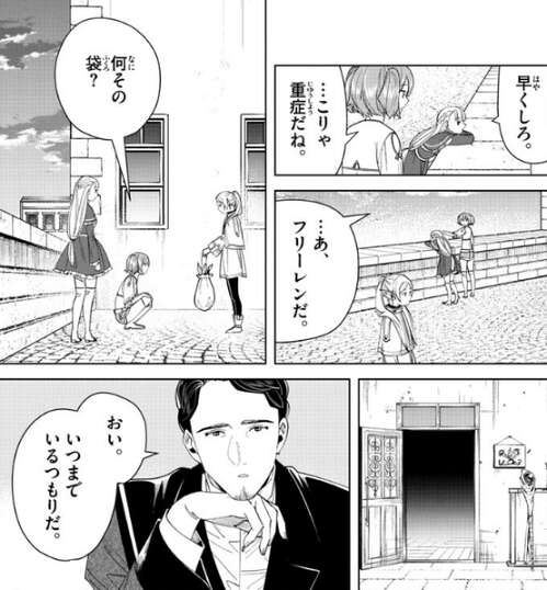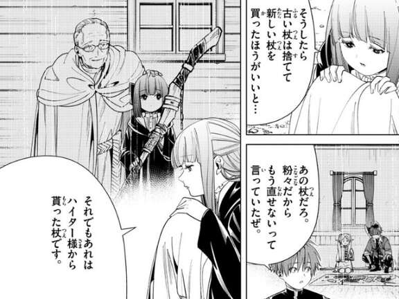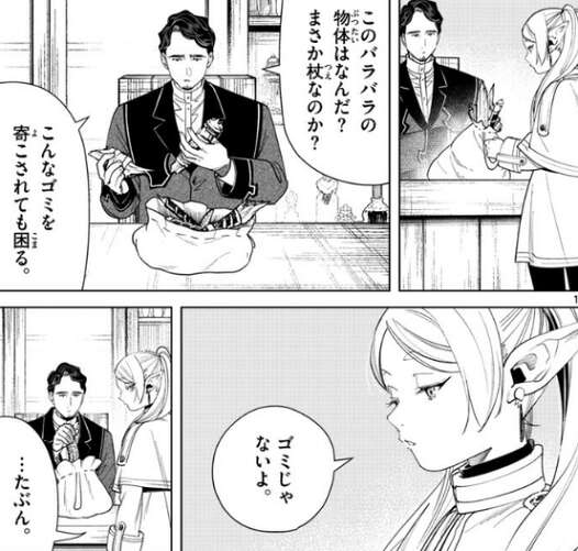 フリーレンが持っていた袋の中身は、フェルンの壊れた杖でしたが、バラバラだったのでリヒターはゴミと勘違いしてしまいます。フリーレンは、ゴミじゃないよ、…たぶん、と否定しますが、リヒターはフリーレンのせいで最悪な気分に戻ったと言い、この杖は諦めるように言います。そう、できないならいいや、とフリーレンが諦めて店を出ようとしますが、出来ないと言われてリヒターは急にやる気を出します。