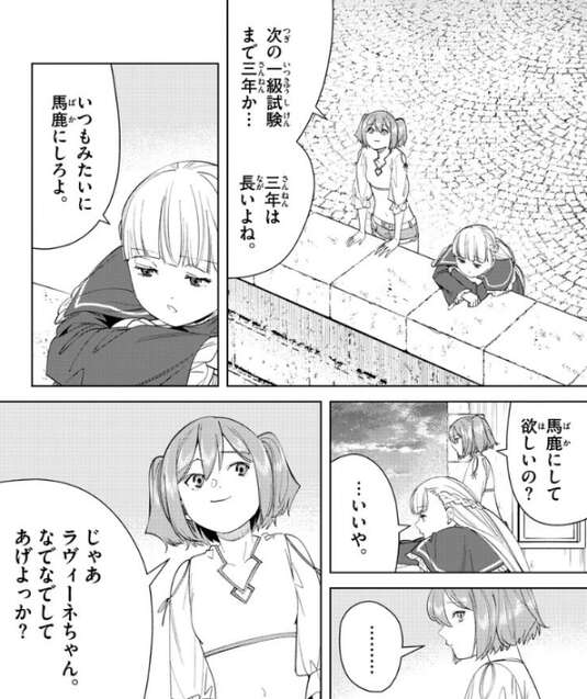場面変わって、ラヴィーネとカンネが二人っきりで話していますが、ラヴィーネは二次試験で落ちてしまったため、落ち込んでいます。カンネは、なでなでしてあげよっか?と、ラヴィーネをおちょくりますが、ラヴィーネはカンネに対して無反応です。いつもならラヴィーネはカンネに馬乗りになり、カンネの髪を引っ張ってしまいそうですが、ラヴィーネは早く馬鹿にするようにカンネに言うばかりです。