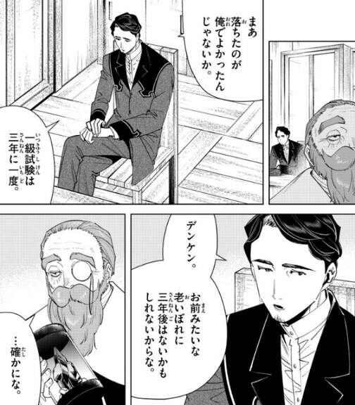 そして、リヒターは落ちたのが俺でよかった、一級試験は三年に一度、デンケンのような老いぼれに三年後はないかもしれない、とデンケンに嫌味を言います。しかし、デンケンは言い返すこともなく、…確かにな、と納得してしまいます。嫌味に対して何も言い返さないので、リヒターはデンケンに、言い返せ、と言います。