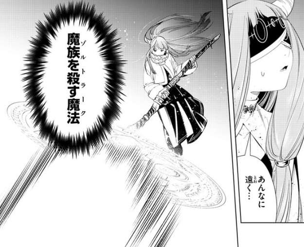 魔族は攻撃がどこから来ているのか探りますが、かなり遠く離れた場所からの攻撃と分かり、魔族は驚きます。驚いている魔族にフェルンは容赦なく、魔族を殺す魔法(ゾルトラーク)で攻撃し、メトーデと戦っている魔族もあっという間に倒してしまいます。