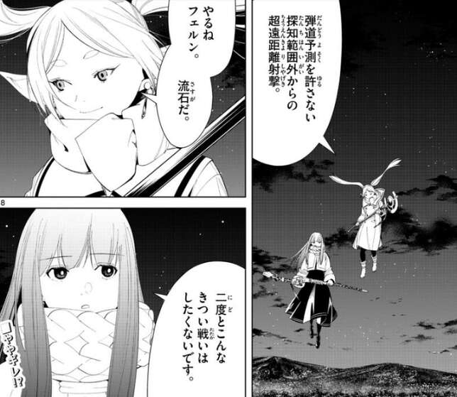 魔族二体を倒したフェルンの所に、高みの見物をしていたフリーレンがやってきます。弾道予測を許さない探知範囲外からの超遠距離射撃による攻撃をフリーレンは褒めますが、二度とこんなきつい戦いはしたくないです、とフェルンは少し怒ったようにフリーレンに返事をします。