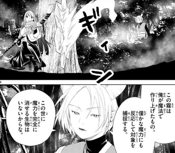 フェルンは魔力を消して潜伏して隙を伺いますが、魔族が作り出した魔法の霧はフェルンの僅かな魔力にも反応して対象を捕捉します。すぐにフェルンは見つかってしまい、再び魔法で攻撃されてしまいます。