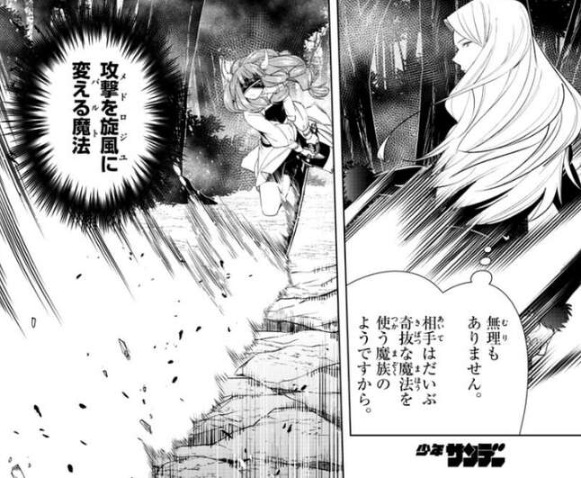 一方、メトーデももう一人の魔族と戦闘中で、相手は攻撃を旋風に変える魔法(メドロジユバルト)を使って、メトーデを攻撃します。メトーデと戦っている魔族は、フェルンと戦っている魔族と違いとても堅実な戦い方をする魔族で、隙がありません。