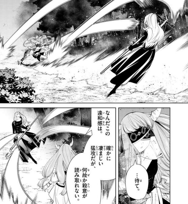 フェルンと協力して打ち崩すのが最適解とメトーデは考えますが、霧の魔法の強力な魔力探知効果でフェルンと合流するのは難しそうです。ならば魔法の霧が晴れれば、戦局が大きく動くとメトーデは考え、魔法による攻撃で魔族を猛攻します。