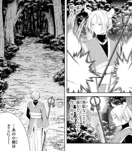 辺り一帯の魔法の霧が晴れ、フェルンがいる場所をあった霧も晴れます。フェルンと戦っていた魔族は、霧などいくらでも作り出せる、と冷静に対応しますが、気が付くとフェルンは姿を消して遠くに移動していました。